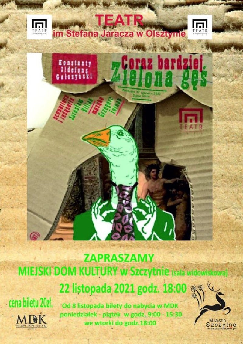 Miejski Dom Kultury w Szczytnie oraz Teatr im. S. Jaracza zapraszają na sztukę "Coraz bardziej Zielona gęś". Spektakl zaplanowano na poniedziałek, 22 22 listopada na godz. 18.00.
