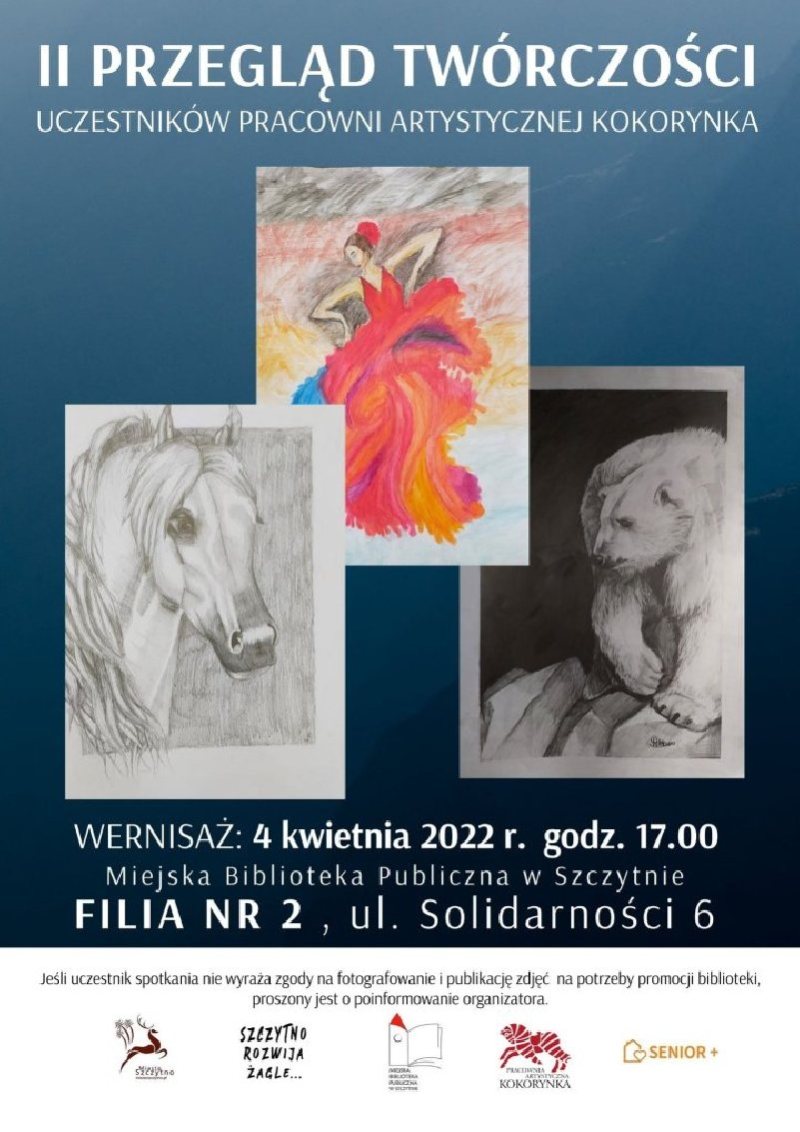 Na poniedziałek, 4 kwietnia w Filii nr 2 przy ulicy Solidarności 6 w Szczytnie zaplanowano II Przegląd Twórczości uczestników pracowni artystycznej Kokorynka. Początek wydarzenia godz. 17. szczegóły na plakacie.