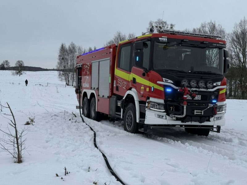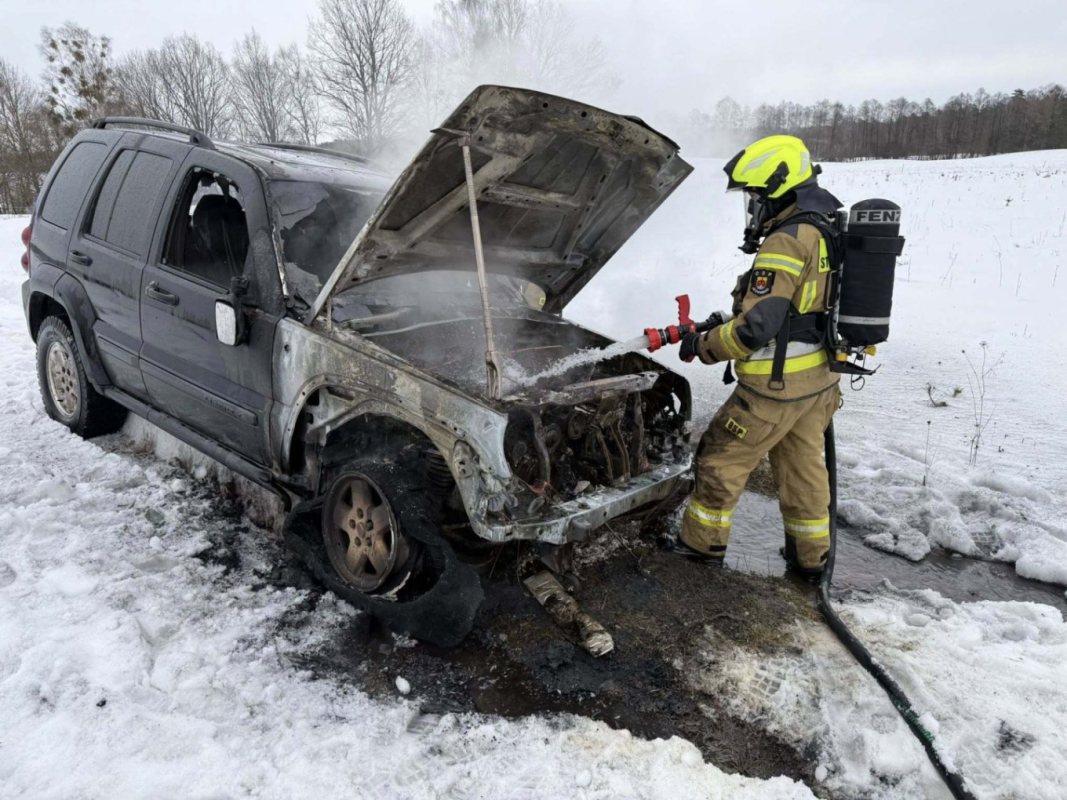 Do zdarzenia zadysponowano strażaków z OSP Jedwabno i PSP Szczytno. Po przybyciu na miejsce potwierdzono, że w samochodzie Jeep Liberty doszło do pożaru w komorze silnika oraz kokpicie pojazdu. Strażacy z OSP Jedwabno natychmiast podjęli działania gaśnicze. Sytuacja została szybko opanowana. Następnie pojazd sprawdzono kamerą termowizyjną, aby wykluczyć ukryte zarzewia ognia.