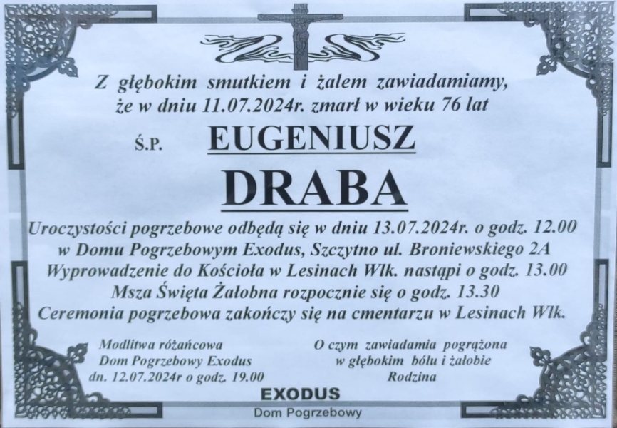 W czwartek, 11 lipca, po długiej chorobie odszedł na wieczną służbę wieloletni strażak i Naczelnik Ochotniczej Straży Pożarnej w Lesinach Wielkich, Eugeniusz Draba. Miał 76 lat. Strażacy i druhowie składają najszczersze wyrazy współczucia rodzinie zmarłego.