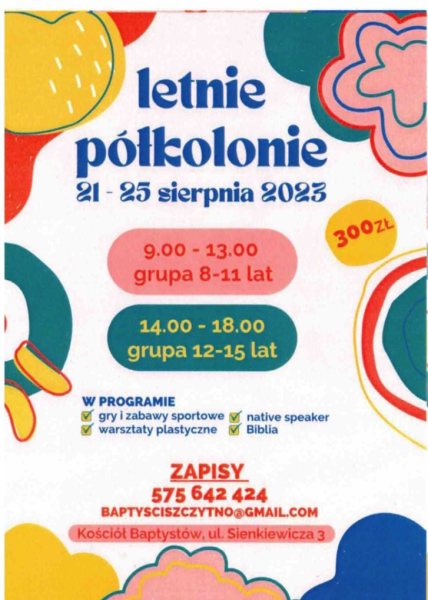 Po kilkuletniej przerwie postanowiliśmy wrócić do tej idei i w dniach 21-25 sierpnia odbędą się przy naszym kościele kolejne Pozytywne Inicjatywy 2023. Od poniedziałku do piątku w godzinach 9.00-13.00 trwać będą półkolonie dla dzieci w wieku od 8-11 lat, zaś w godzinach popołudniowych od 14.00-18.00 - półkolonie dla nastolatków w wieku od 12-15 lat. Zajęcia będą się odbywały pod namiotem na naszej kościelnej posesji, która mieści się tuż obok molo i plaży miejskiej. W bogatym i ciekawym programie przewidujemy różnego rodzaju gry i zabawy sportowe, warsztaty plastyczne, zajęcia języka angielskiego z udziałem native speaker’a z Nowej Zelandii oraz ciekawe lekcje biblijne.