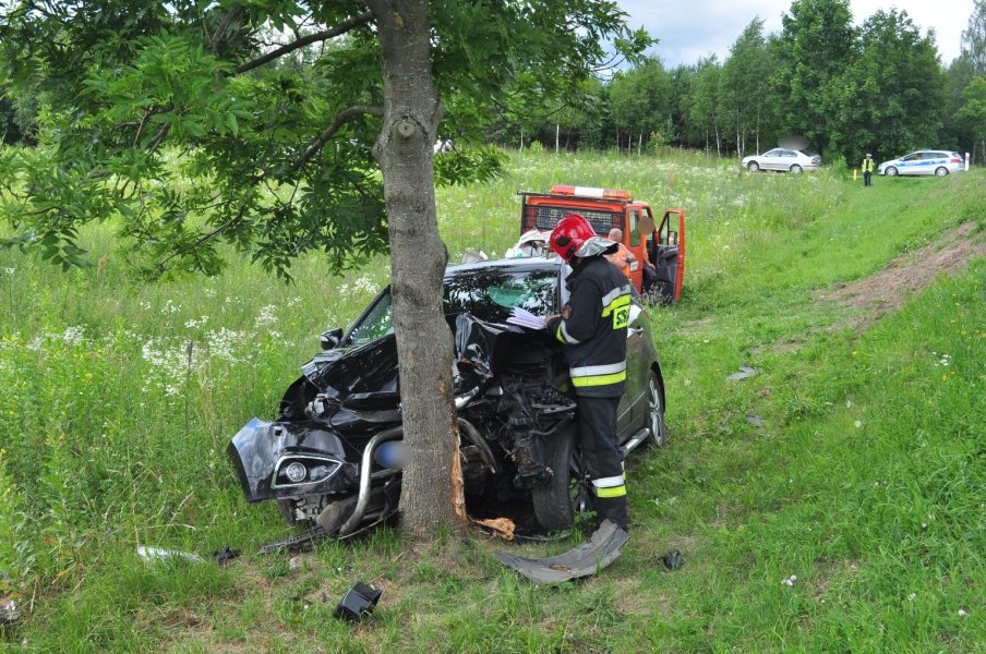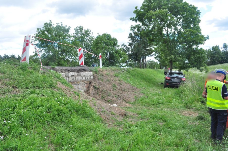 Do dramatycznego wypadku doszło w okolicach Dębówka. Kierowca hyundaia próbując uniknąć czołowego zderzenia ze skodą, która zajechała mu drogę, odbił w prawo, przeleciał przez przepust, który akurat był remontowany i zatrzymał się na drzewie.
