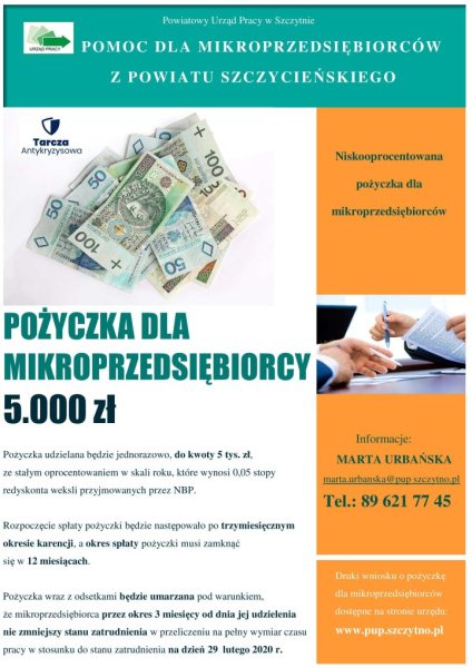 Dyrektor Powiatowego Urzędu Pracy w Szczytnie ogłasza nabór wniosków o udzielenia pożyczki na pokrycie bieżących kosztów prowadzenia działalności gospodarczej dla mikroprzedsiębiorcy.