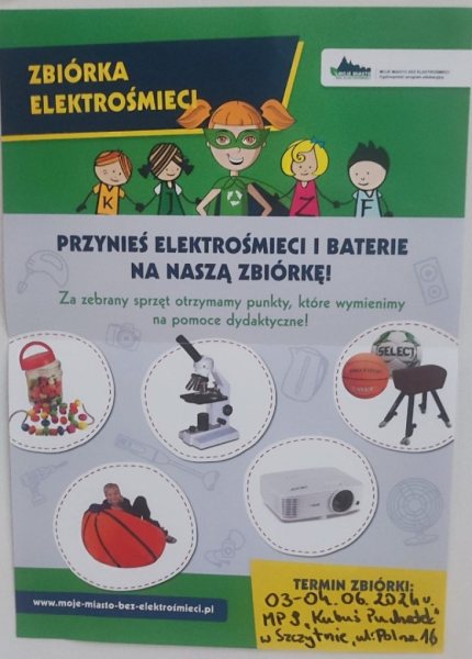 Zbiórka elektrośmieci odbędzie się w dniach 3-4 czerwca na terenie przedszkola przy ul. Polnej 16. Mieszkańcy Szczytna mogą włączyć się do akcji, przynosząc zużyte baterie oraz inne elektrośmieci, takie jak stare telewizory, komputery, telefony czy inne urządzenia elektroniczne...