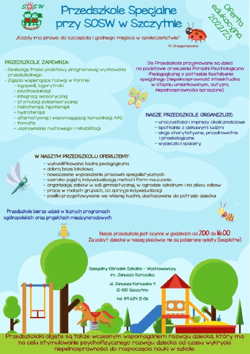 Przedszkole Specjalne przy Specjalnym Ośrodku Szkolno-Wychowawczym w Szczytnie zaprasza do zapoznania się z ofertą edukacyjną, rewalidacyjną i opiekuńczo - wychowawczą.