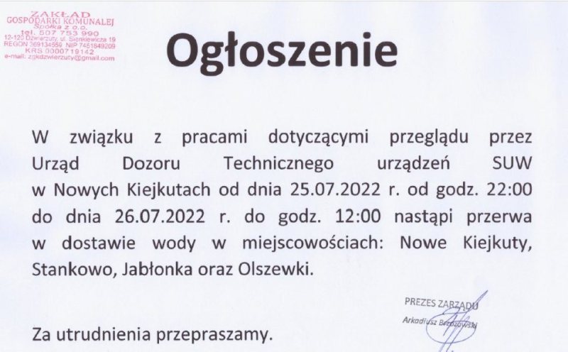 Zakład Gospodarki Komunalnej w Dźwierzutach informuje o przerwie w dostawie wody w: Nowych Kiejkutach, Stankowie, Jabłonce i Olszewce.
