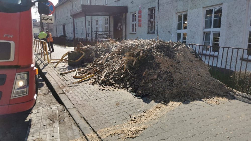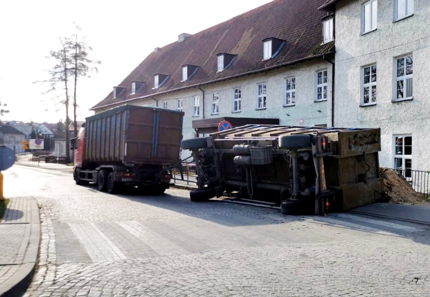 Groźny incydent na ulicy Konopnickiej w Szczytnie. Dziś rano przewróciła się tam, na chodnik, naczepa ciężarówki wyładowana odpadami, w ty trocinami. Na szczęście nikt nim nie szedł.