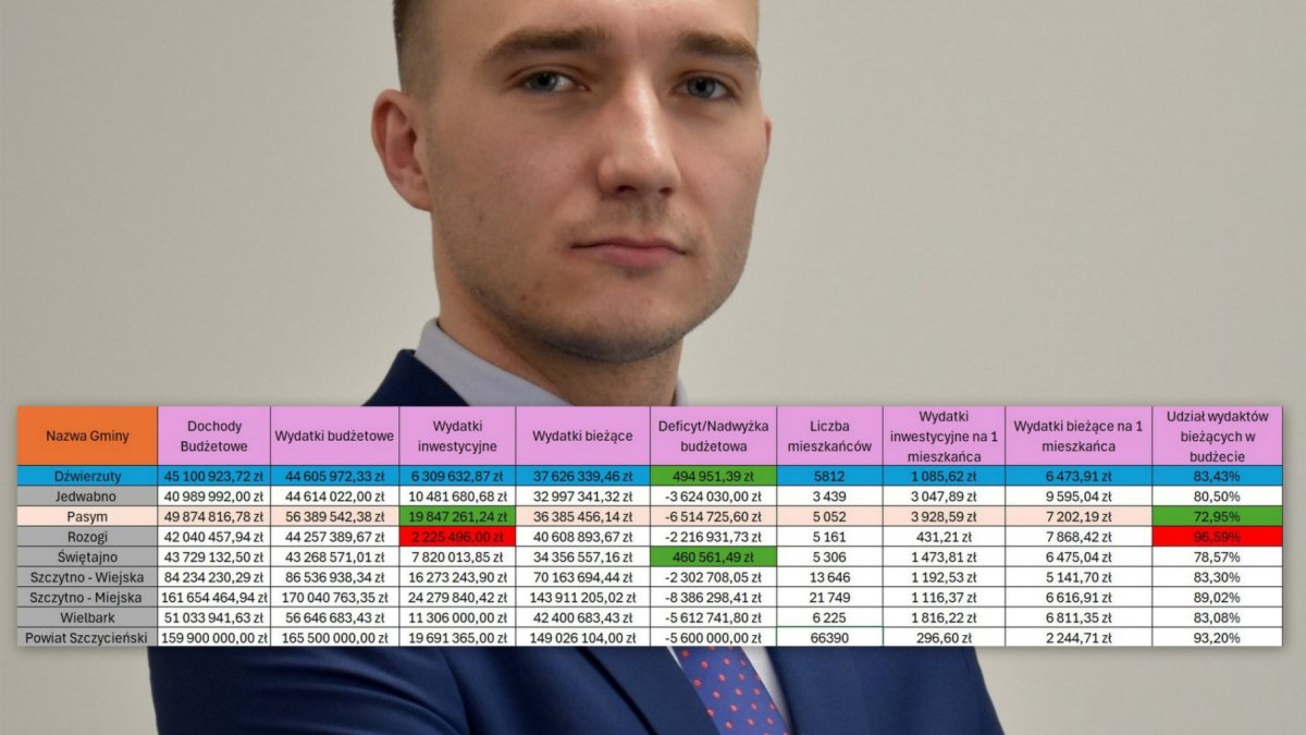 Radny Tomasz Bojanowski wziął pod lupę budżety wszystkich samorządów w powiecie szczycieńskim. Z jego analizy wynika, że tylko Dźwierzuty i Świętajno zaplanowały nadwyżkę. Pasym inwestuje prawie 20 mln zł, Jedwabno wydaje na inwestycje ponad 3 tys. zł na mieszkańca, a Dźwierzuty z kwotą 1 085,62 zł plasują się na przedostatnim miejscu wśród gmin wiejskich. Dane pochodzą z pierwotnych uchwał budżetowych opublikowanych w Dzienniku Województwa Warmińsko-Mazurskiego.