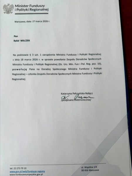 Rafał Wilczek ze Szczytna został powołany do siedmioosobowego Zespołu Doradców Społecznych przy Ministrze Funduszy i Polityki Regionalnej. Decyzję podpisała minister Katarzyna Pełczyńska-Nałęcz. To oznacza, że samorządowiec z regionu będzie współpracował przy planowaniu działań na poziomie krajowym.