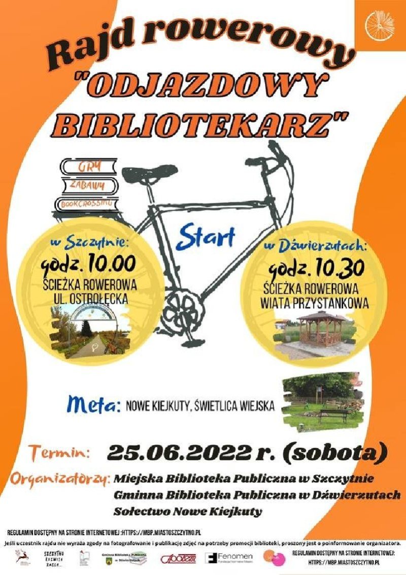 Miejska Biblioteka Publiczna w Szczytnie, Gminna Biblioteka Publiczna w Dźwierzutach oraz Sołectwo Nowe Kiejkuty zapraszają na Rajd Rowerowy "Odjazdowy bibliotekarz", który odbędzie się w sobotę 25 czerwca 2022 r.