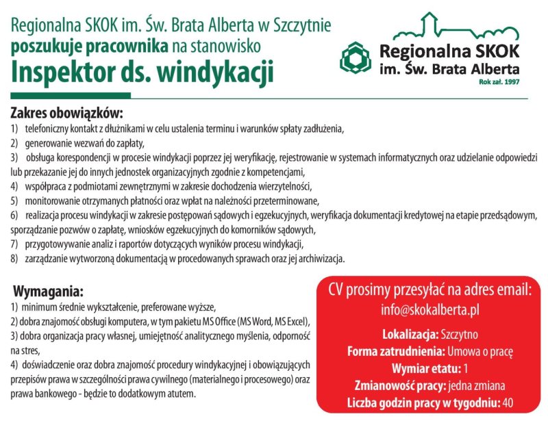Regionalna SKOK im. Św. Brata Alberta w Szczytnie poszukuje pracownika na stanowisko Inspektor ds. windykacji. CV prosimy przesyłać na adres email: info@skokalberta.pl