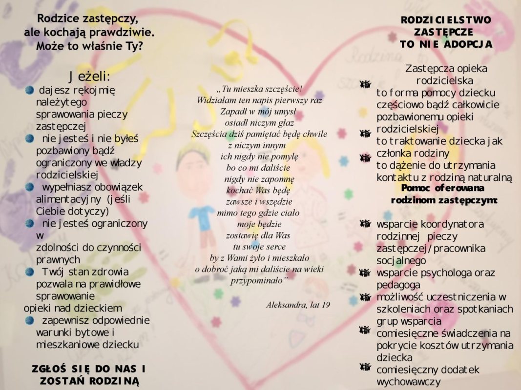 - Praca rodzin zastępczych jest ogromnym wyzwaniem, wymagająca wielu wyrzeczeń i poświęceń, aby pracować z dziećmi po trudnych przeżyciach w rodzinnych domach, pozostawiających ślad przez wiele kolejnych lat – podkreśla Ewelina Dylewska-Dercz, kierownik Zespołu Pieczy Zastępczej z Powiatowego Centrum Pomocy Rodzinie, które rodzinom zastępczym oferuje wszechstronną pomoc. - Rodziny te objęte są wsparciem koordynatora rodzinnej pieczy zastępczej, pedagoga, psychologa, pracownika socjalnego oraz prawnika. Wsparcie rodzin jest wielopłaszczyznowe, od usług doradczych poprzez indywidualną pracę z dzieckiem, diagnozowanie środowiska rodzinnego czy wsparcia grupowego. Staramy się integrować rodziny i dzieci w nich przebywające oraz doskonalić ich kompetencje wychowawcze poprzez organizowanie szkoleń, imprez okolicznościowych oraz zajęć edukacyjno-warsztatowych dla dzieci – zachęca kierownik Dylewska-Dercz. - Serdecznie zapraszamy do siedziby naszego Centrum osoby, którym nie jest obojętny los dzieci, pozbawionych czasowo lub trwale opieki rodzicielskiej.