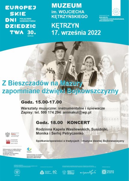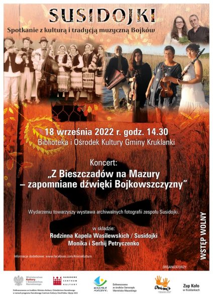 Stowarzyszenie Anima zaprasza 17 września o godz. 18.00 do Muzeum im. W. Kętrzyńskiego w Kętrzynie i 18 września o godz. 14.30 do Gminnego Ośrodka Kultury w Kruklankach na koncerty poświęcone muzyce bieszczadzkiej Bojkowszczyzny w wykonaniu Rodzinnej Kapeli Wasilewskich z Susidojkami oraz Serhija i Moniki Petryczenków.