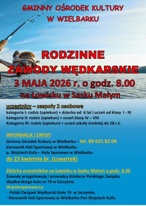 Wielbark zaprasza na rodzinne zawody wędkarskie. Wydarzenie odbędzie się w sobotę 3 maja na łowisku w Sasku Małym. Start o godz. 8.00.