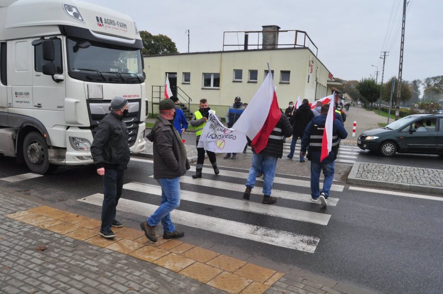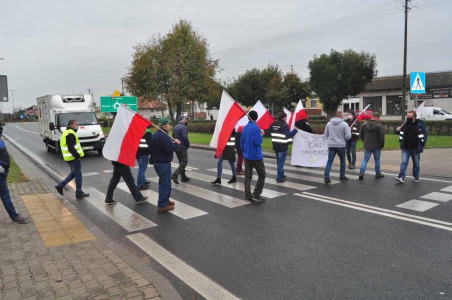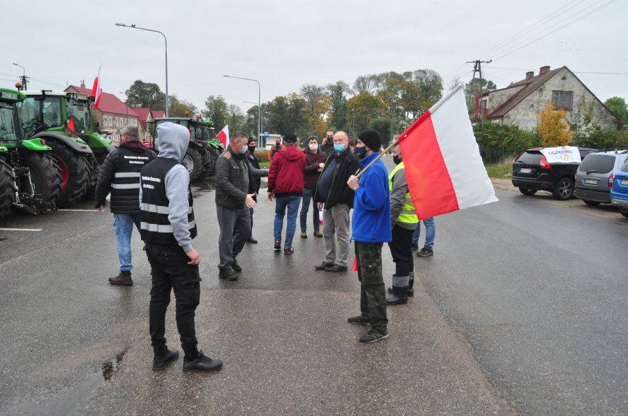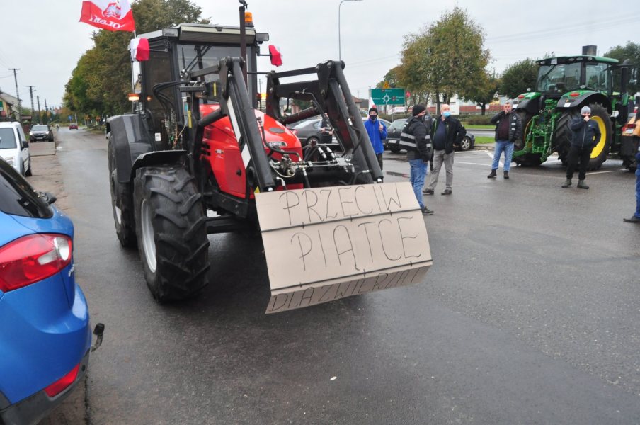 Przed godz. 9 zaczęły zjeżdżać potężne ciągniki. Zaparkowały na ulicy Rynek wzdłuż ruchliwej krajówki. Finalnie pojawiło się kilkudziesięciu rolników. Były flagi i transparenty. Chwilę po godz. 9 część rolników poszła chodnikiem i przez przejścia dla pieszych w pobliże ronda, a część zaczęła jeździć po nim ciągnikami. Droga była systematycznie blokowana, ale co chwila też udrażniana.