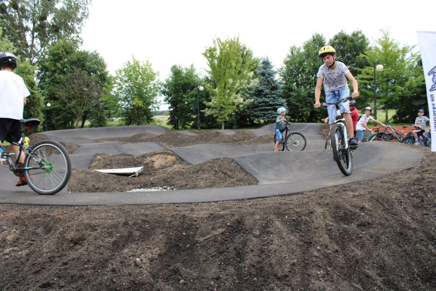 Obiekt został wybudowany w parku, nad rzeką. Jak widać na zdjęciach, już w dniu otwarcia pumptrack cieszył się ogromnym powodzeniem, a chętnych do sprawdzenia jego jakości nie brakowało.