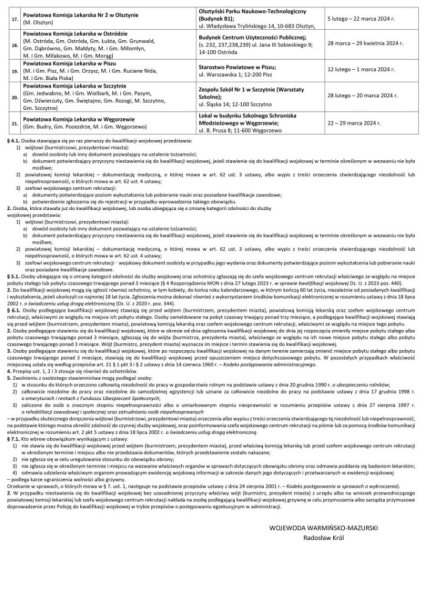 W naszym powiecie kwalifikację wojskową zaplanowano od 28 lutego do 20 marca. Odbędzie się ona w budynku Warsztatów Szkolnych Zespołu Szkół nr 1 w Szczytnie przy ulicy Śląskiej 14. To istotny moment dla młodych obywateli, którzy podejmą decyzję dotyczącą ewentualnej służby wojskowej.