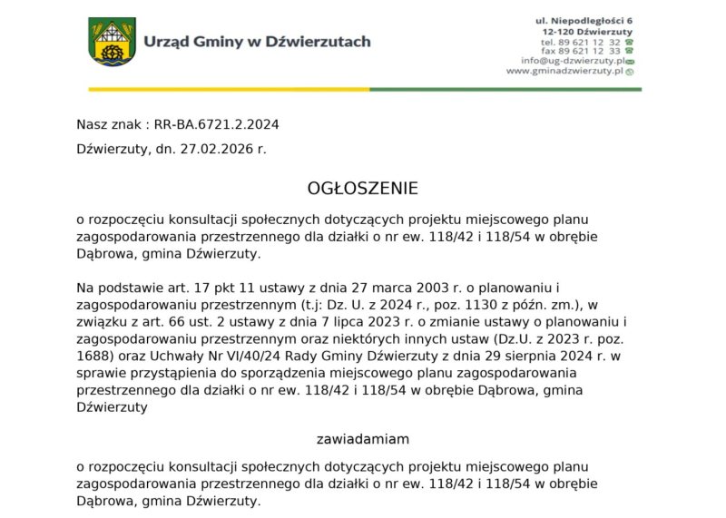 Zawiadamiam, że od dnia 27.02.2026r. rozpoczynają się konsultacje społeczne dotyczące miejscowego planu zagospodarowania przestrzennego dla działki o nr ew. 118/42 i 118/54 w obrębie Dąbrowa, gmina Dźwierzuty, które trwać będą do dnia 31.03.2026r.