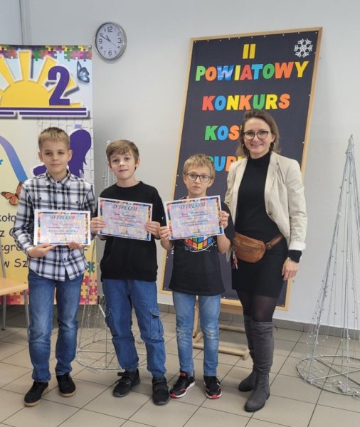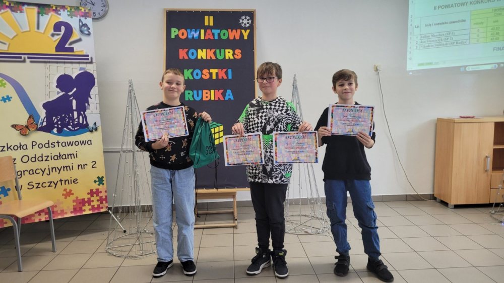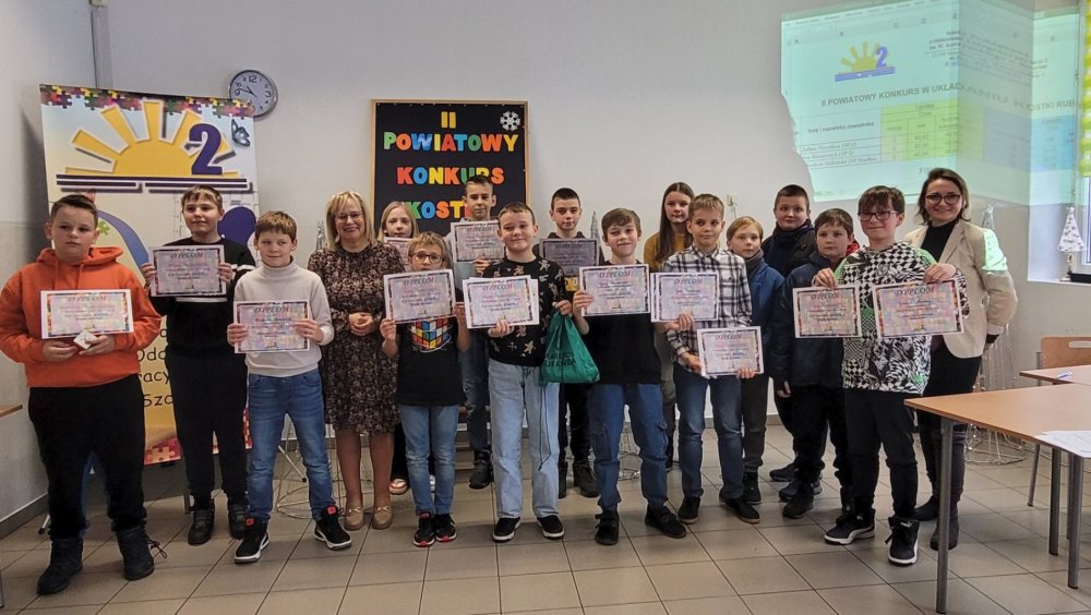 W piątek, 15 grudnia, uczniowie szkół z naszego powiatów wzięli udział w emocjonującym II Powiatowym Konkursie Kostki Rubika zorganizowanym przez SPzOI nr 2. Młodzi entuzjaści łamigłówki nie zawiedli. Triumfatorem został Julian Nieróbca ze SP6. Największe wrażenie zrobił jednak Jan Ślusarczyk, zdobywając II miejsce i ustanawiając rekord w szybkości ułożenia kostki. Zrobił to w 25 sekund!