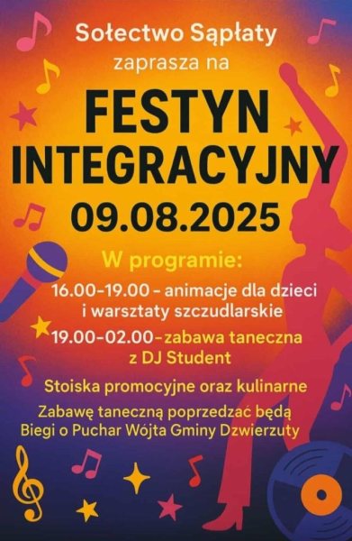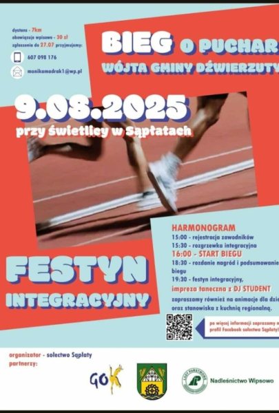 Sołectwo Sąpłaty zaprasza na wydarzenie, które połączy sport, zabawę i lokalną integrację. W sobotę, 9 sierpnia, o godz. 16:00 rozpocznie się bieg na dystansie 7 km. Uczestnicy wystartują sprzed świetlicy, a trasa poprowadzi przez urokliwe okolice leśne. Wcześniej – od godz. 15:00 – odbędzie się rejestracja zawodników, a o 15:30 wspólna rozgrzewka.