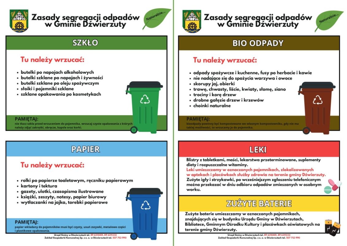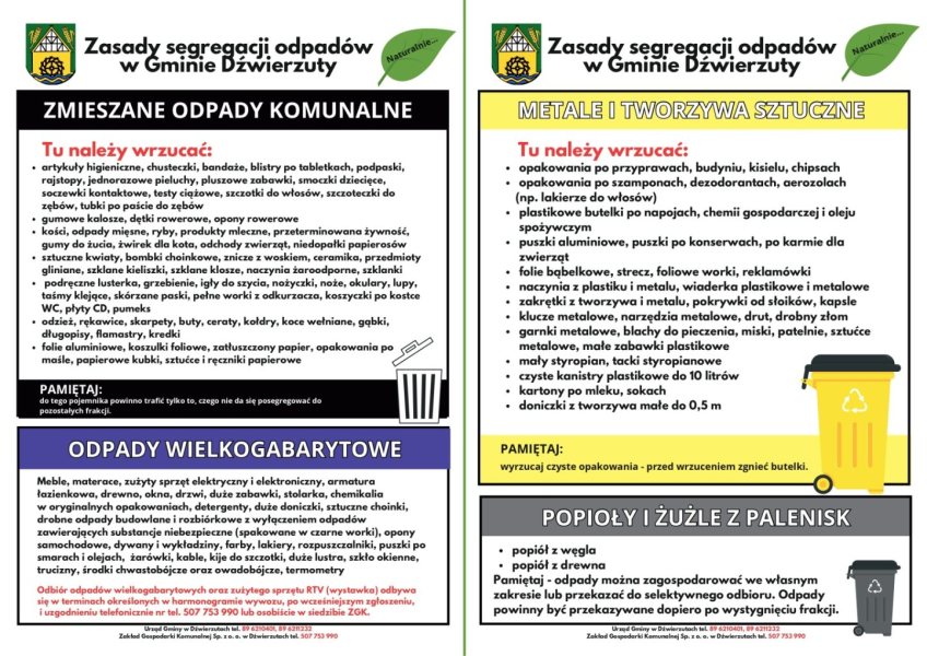 W specjalnej ulotce urzędnicy Gminy Dźwierzuty przypominają, jak segregować odpady komunalne. Segregacja ważna jest dla środowiska, ale też i... portfeli osób segregujących. Brak segregacjo to pewna kara. Warto zatem zapoznać się z instruktarzem przygotowanym rzez gminę.