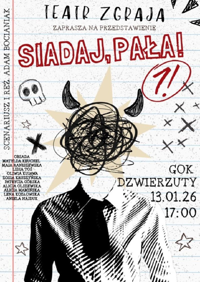 13 stycznia w Gminnym Ośrodku Kultury w Dźwierzutach młodzi aktorzy powiedzą to, co zwykle zostaje w głowie. Spektakl „Siadaj, pała!” to opowieść o dojrzewaniu, ocenach i napięciu, które narasta w szkolnych murach. Wstęp wolny, ale liczba miejsc jest ograniczona.