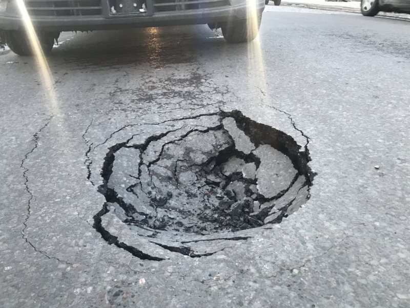 Ogromna wyrwa w jezdni powstała tuż przed mostem łączącym dwa jeziora. „Właścicielem” ulicy Sienkiewicza jest Generalna Dyrekcja Dróg Krajowych i Autostrad.