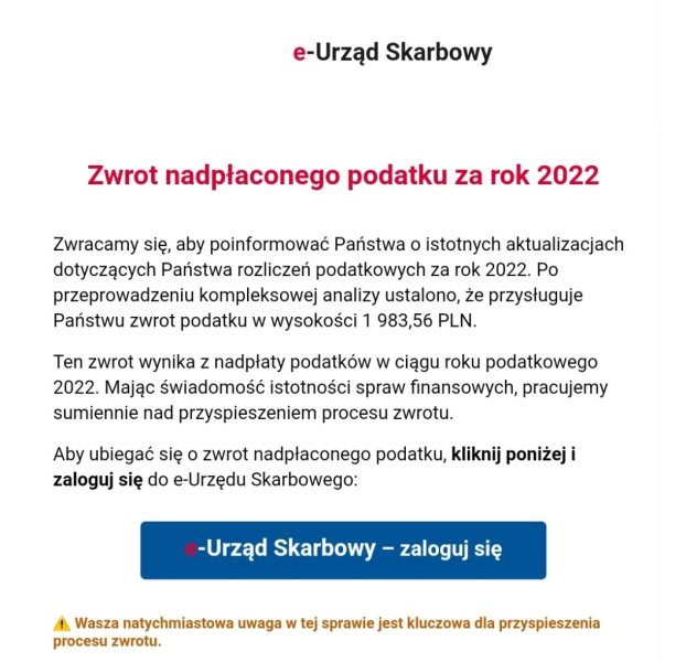 Do Ministerstwa Finansów docierają sygnały o wiadomościach e-mail, w których nadawca informuje o przysługującym podatnikowi zwrocie nadpłaconego podatku i zachęca do zalogowania się w serwisie e-Urząd Skarbowy. W rzeczywistości po kliknięciu w baner logowania podatnik jest kierowany na stronę, która służy do wyłudzania danych.
