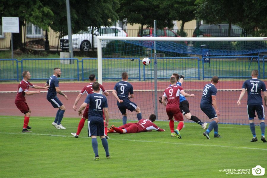 Pierwsze minuty nie zwiastowały wysokiej porażki. Niestety już w 24 minucie fatalny błąd popełnił Paweł Brzozowski, który przepuścił między nogami strzał zza pola karnego. Zanim Błękitni zdążyli odpowiedzieć mieliśmy już drugą bramkę. Tym razem napastnik Mazura wykorzystał złe ustawienie obrońców Błękitnych i głową skierował piłkę do siatki.