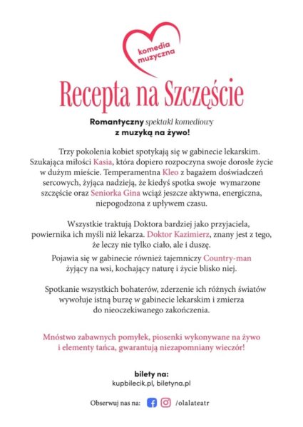Gabinet lekarski, trzy kobiety i jeden doktor, który leczy nie tylko ciało, ale i duszę. Do tego muzyka na żywo, błyskotliwe dialogi i sytuacje, które wymykają się spod kontroli. 23 maja Miejski Dom Kultury w Szczytnie zamieni się w scenę pełną emocji. O godzinie 16:00 rozpocznie się spektakl „Recepta na szczęście” – komedia, która łączy humor, wzruszenie i energię teatru na żywo.