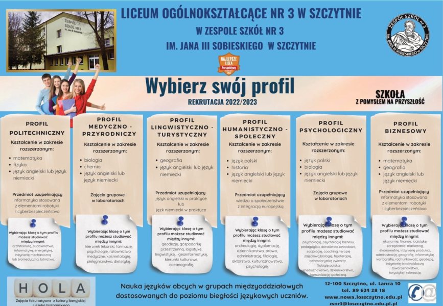 W tym roku propozycja edukacyjna Sobiecha obejmuje następujące profile: politechniczny, medyczno-przyrodniczy, humanistyczno-społeczny, lingwistyczno-turystyczny, psychologiczny i biznesowy. Charakterystyka każdej z tych propozycji będzie przedstawiona i omówiona w czasie wspomnianych Dni Otwartych w Liceum Ogólnokształcące nr 3 w Szczytnie.