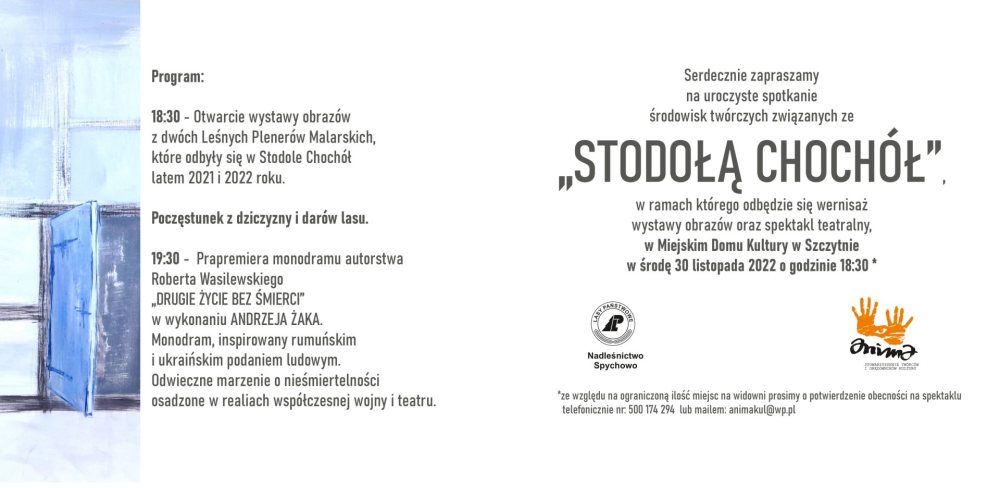 Stowarzyszenie Twórców i Orędowników Kultury ANIMA i działający pod ich auspicjami Teatr Chochół zapraszają na prapremierę monodramu autorstwa Roberta Wasilewskiego pt. DRUGIE ŻYCIE BEZ ŚMIERCI.
