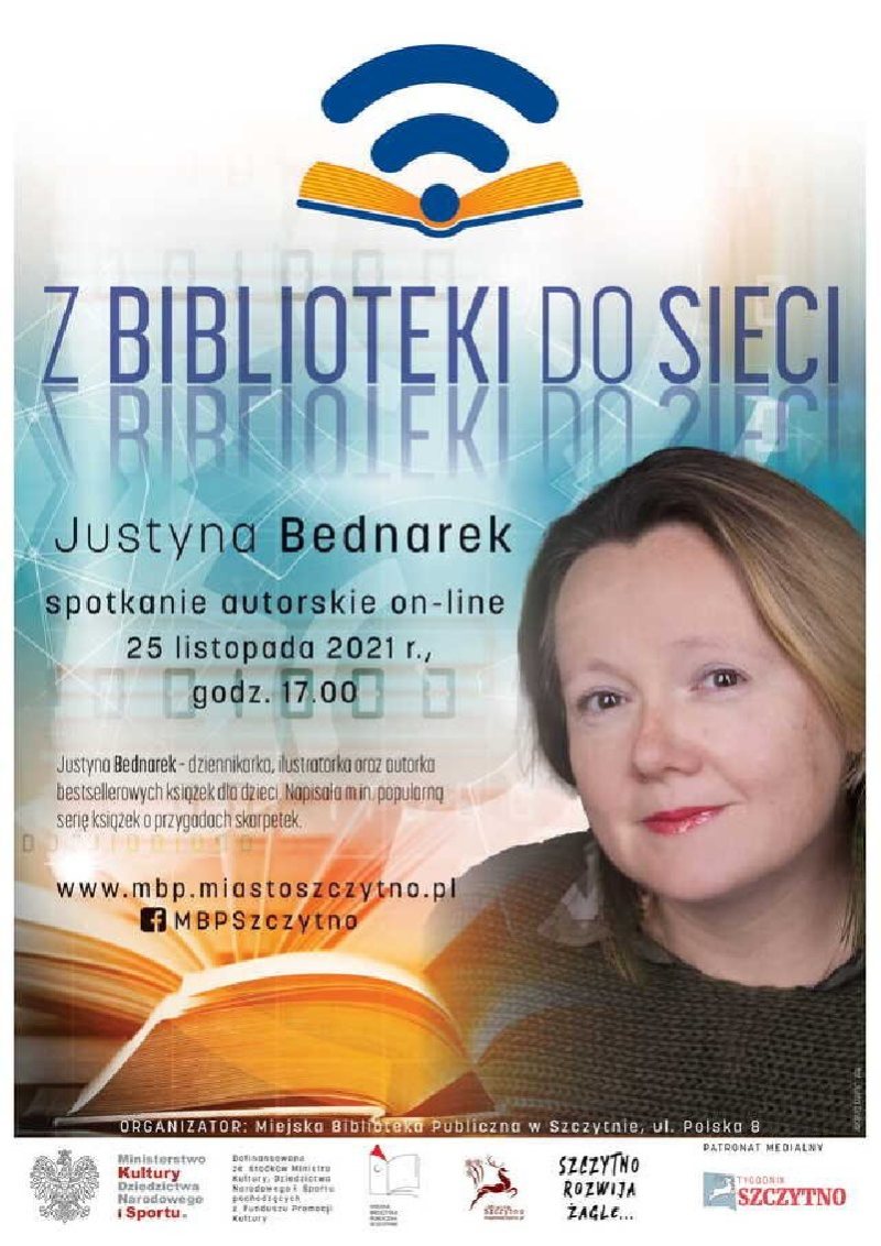 Zapraszamy na kolejne z cyklu spotkań autorskich realizowanych w ramach projektu "Z BIBLIOTEKI DO SIECI". 25 listopada o godz. 17.00 z MBP w Szczytnie połączy się Justyna Bednarek - dziennikarka, ilustratorka oraz autorka bestsellerowych książek dla dzieci. Napisała m.in. popularną serię książek o przygodach skarpetek.