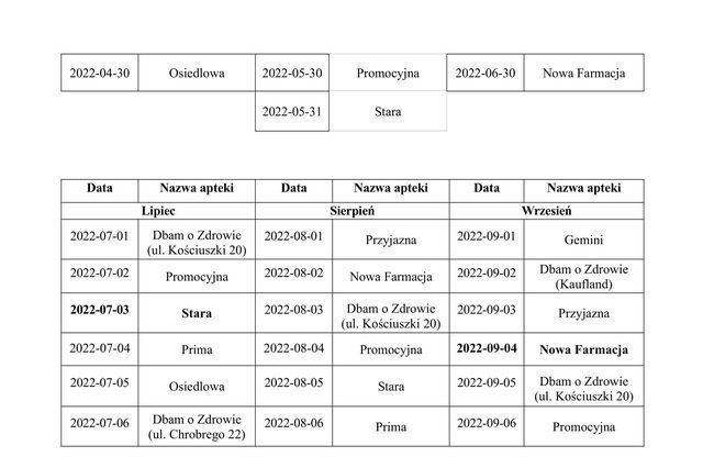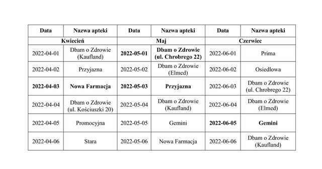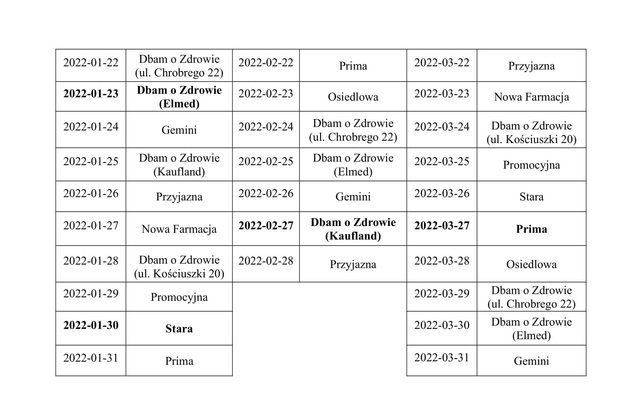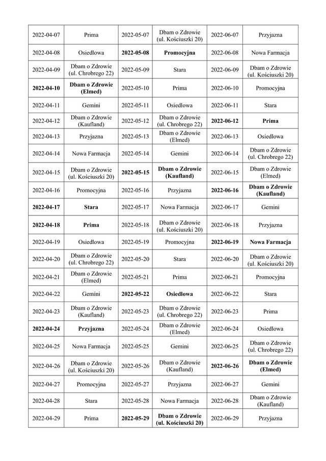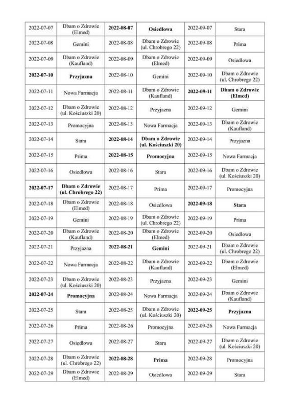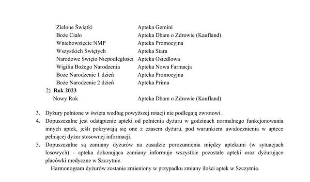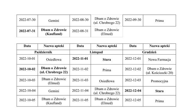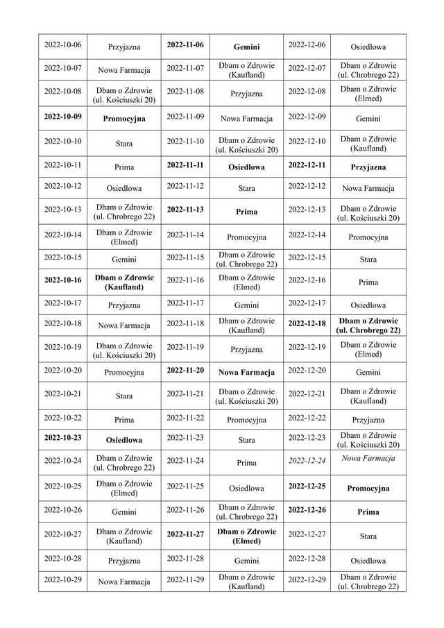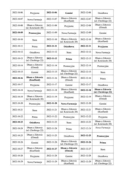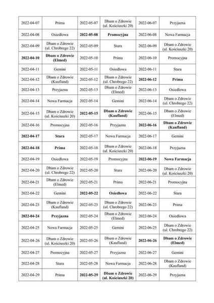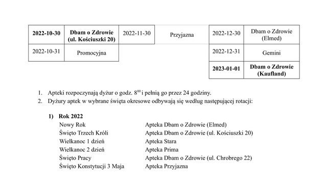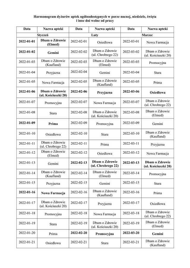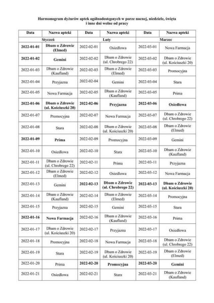 Poniżej znajduje się informacja dotycząca dyżurów aptek ogólnodostępnych w porze nocnej, niedziele, święta i inne dni wolne od pracy w roku 2022.