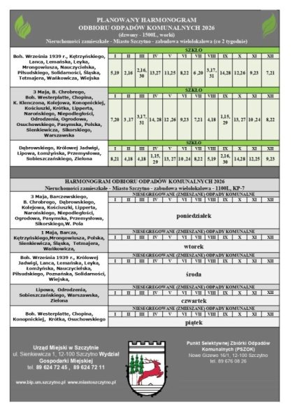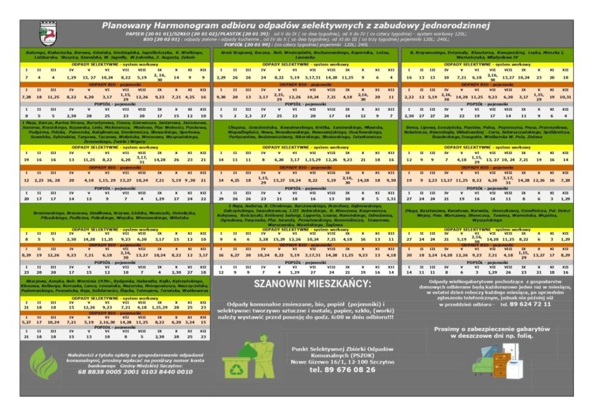 Nowe harmonogramy obejmują zarówno zabudowę jednorodzinną, jak i wielolokalową. Zawierają dokładne daty odbioru odpadów zmieszanych, selektywnych, bioodpadów, popiołu oraz gabarytów. Miasto przypomina, że odpady należy wystawiać w dniu odbioru, do godziny 6.00 rano.