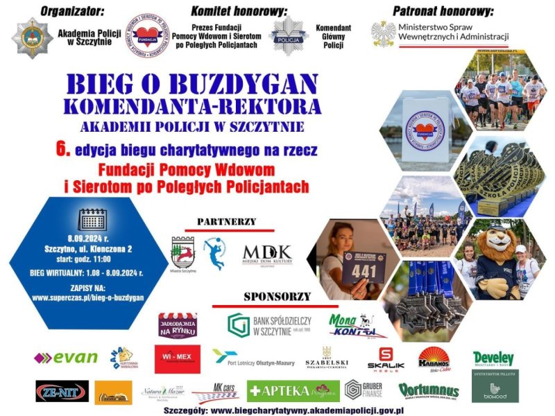 Akademia Policji w Szczytnie zaprasza do udziału w 6. edycji Biegu o Buzdygan Komendanta-Rektora, organizowanego na rzecz Fundacji Pomocy Wdowom i Sierotom po Poległych Policjantach. Wydarzenie odbędzie się w niedzielę, 8 września, a jego celem jest wsparcie rodzin poległych funkcjonariuszy policji.