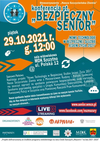 Jest to konferencja pt. „BEZPIECZNY SENIOR”, na którą zapraszamy wszystkich zainteresowanych, nie tylko uczestników naszego projektu. To spotkanie ma służyć przede wszystkim podniesieniu poczucia bezpieczeństwa seniorów zamieszkujących nasz powiat, dlatego skupimy się na metodach oszustw i wyłudzeń, które zarejestrowano w ostatnim czasie na naszym terenie. Podczas spotkania usłyszymy prelekcje przedstawiciela Urzędu Komunikacji Elektronicznej, Powiatowego Rzecznika Praw Konsumentów oraz funkcjonariuszy z Komendy Powiatowej Policji w Szczytnie.