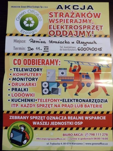 Okazuje się, że każdy z nas ma szanse na wsparcie strażaków. Wystarczy oddać im swoje "elektrośmieci". Środki pozyskane poprzez zbiórkę zalegających „elektrośmieci”, otrzymają właśnie jednostki OSP, dla których przekażemy sprzęt. Po ogłoszeniu zbiórki przez jednostkę w Płozach, do projektu dołączyła również jednostka z Olszyn.