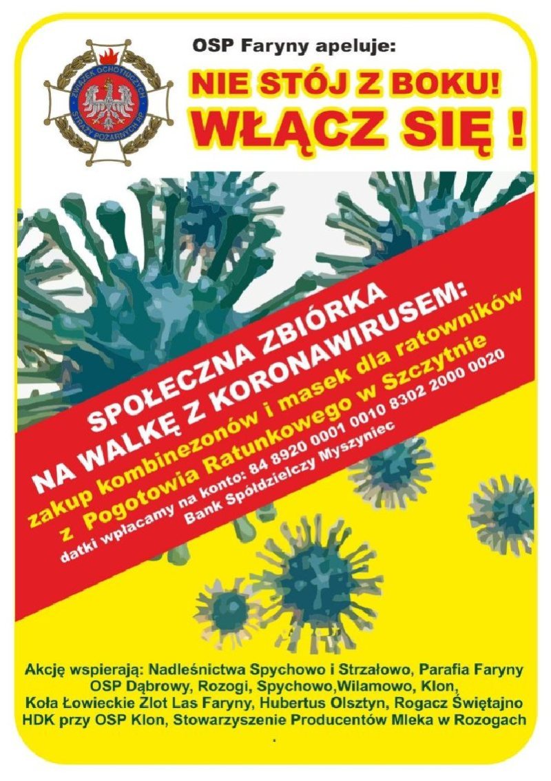 Kolejna działania pomocowe dla ratowników medycznych z naszego powiatu. Tym razem akcję zbierania potrzebnych środków na sprzęt ochronny rozkręcają strażacy z Ochotniczej Straży Pożarnej w Farynach. Proszą o pomoc w rozpropagowaniu ich działań. Szczegóły na plakacie.