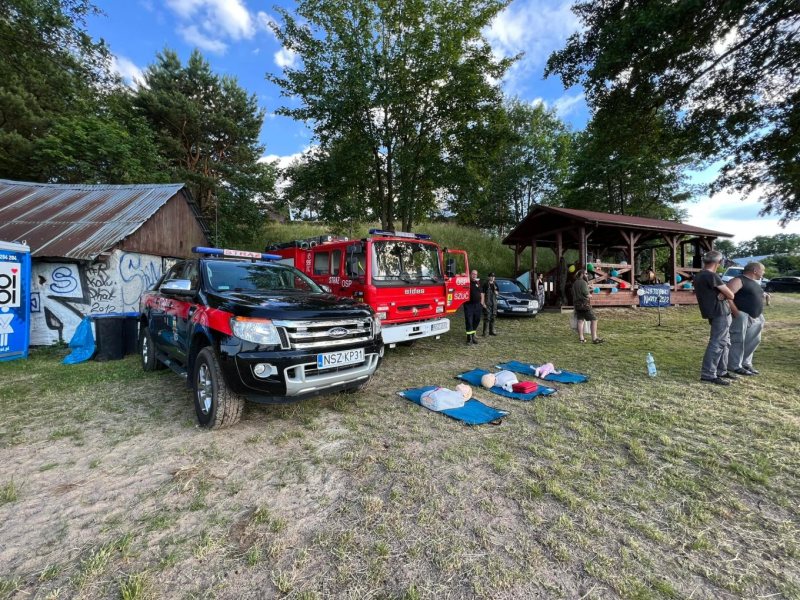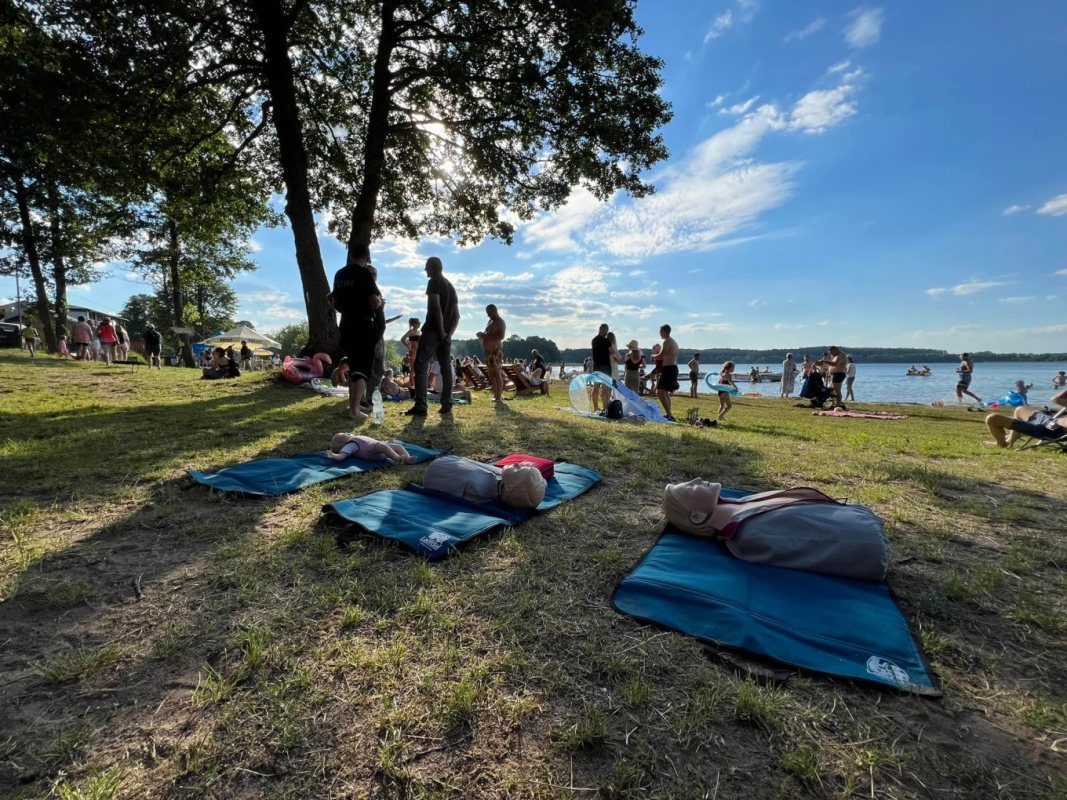 Druhowie Rafał Malinowski, Michał Wojciechowski oraz Marcin Zapadka przypominali uczestnikom wydarzenia o podstawowych zasadach bezpieczeństwa nad wodą oraz postępowaniu z osobą poszkodowaną po wyciągnięciu z wody.