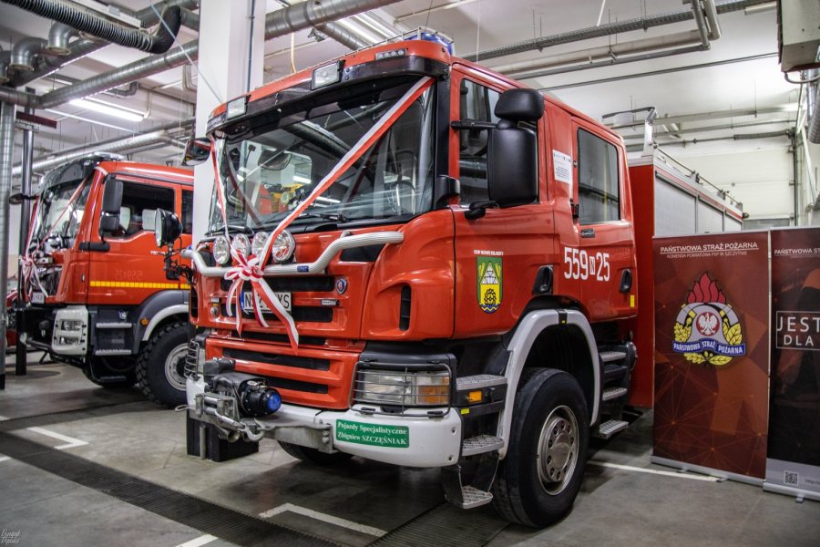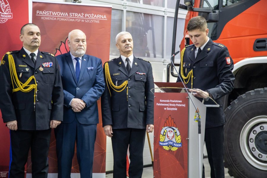 W piątek 10 lutego w Komendzie Powiatowej Państwowej Straży Pożarnej w Szczytnie odbyła się uroczystość przekazania dwóch ciężkich samochodów ratowniczo-gaśniczych. Do szczycieńskiej komendy trafił fabrycznie nowy samochód na podwoziu marki Man. Z nowego wozu mogą cieszyć się również ochotnicy z Nowych Kiejkut, którzy w ramach przesunięć taboru otrzymali używaną do tej pory przez szczycieńskich zawodowców Scanię. Była to również świetna okazja na nadanie odznaczeń i medali resortowych.