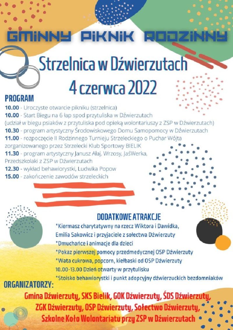 Nie zabraknie atrakcji, a wśród nich między innymi: bieg na 6 łap spod przytuliska dla zwierząt w Dźwierzutach, program artystyczny Środowiskowego Domusmopomocy w Dźwierzutach, czy II Rodzinny Turniej Strzelecki o Puchar Wójta zorganizowany przez Strzelecki Klub Sportowy Bielik...