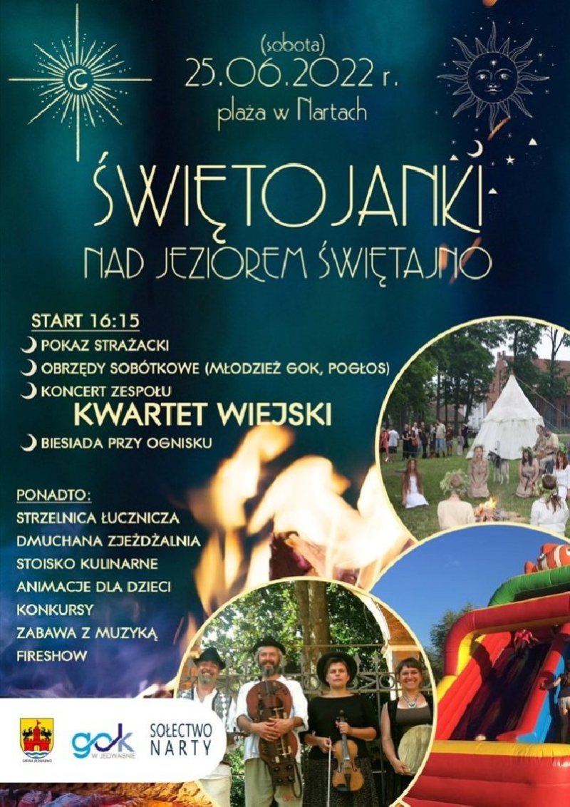 Gminy Ośrodek Kultury w Jedwabnie serdecznie zaprasza na „Świętojanki nad jeziorem Świętajno”, które odbędą się 25.06.2022 r., na plaży w Nartach. Tradycyjnie nie zabraknie magii, rusałek, oraz zabaw… Szczegóły na plakacie.