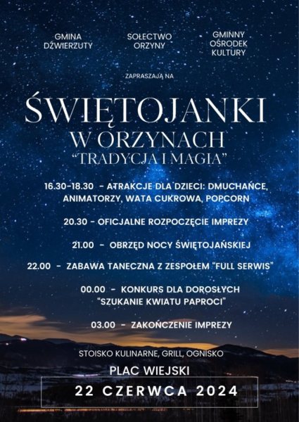 W Orzynach impreza rozpocznie się o 16:30 atrakcjami dla dzieci, takimi jak dmuchańce, animacje, wata cukrowa i popcorn. Oficjalne rozpoczęcie zaplanowano na 20:30, a godzinę później odbędzie się obrzęd nocy świętojańskiej. O 22:00 wszyscy będą mogli bawić się na zabawie tanecznej z zespołem "Full Serwis". Na północ przewidziano konkurs dla dorosłych "Szukanie kwiatu paproci". Zakończenie imprezy planowane jest na 3:00 rano.