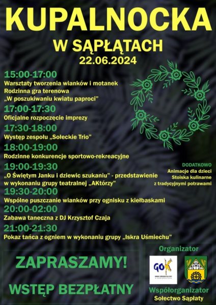 W Sąpłatach impreza rozpocznie się o godzinie 15:00 warsztatami tworzenia wianków i motanek oraz rodzinną grą terenową "W poszukiwaniu kwiatu paproci". Oficjalne otwarcie nastąpi o 17:00, po czym na scenie wystąpi zespół "Sołeckie Trio". W planie są także rodzinne konkurencje sportowo-rekreacyjne oraz przedstawienie teatralne "O Świętym Janku i dziewic szukaniu" w wykonaniu grupy "AKTórzy".