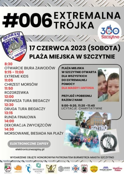 W sobotę, 17 czerwca odbędzie się już szósta edycja Ekstremalnej Trójki, którą organizują Morsy Reset Szczytno. Organizatorzy przygotowali specjalne tory przeszkód dla dorosłych i dzieci. Wydarzenie odbędzie się tradycyjnie na plaży miejskiej i tradycyjnie będzie miało charakter charytatywny. Tym razem będą zbierane fundusze na rzecz Magdy i Antosia z naszego powiatu.
