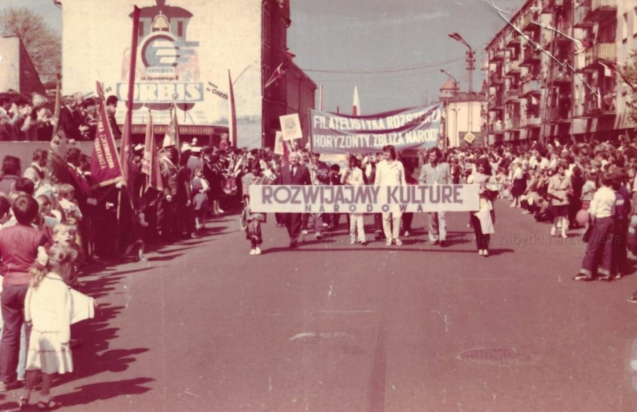 Orkiestra stawała po drugiej stronie ulicy Polskiej i przygrywała maszerującym. Niektóre grupy zatrzymywały się przed trybuną i prezentowały swój dorobek. Większe zakłady pracy przygotowywały modele swoich produktów – prym wiodła tu Unima. Browar paradował z własnym logo, a rybacy nieśli złowione przez siebie ryby – na jednym ze zdjęć widać ich ze szczupakiem i węgorzem.
