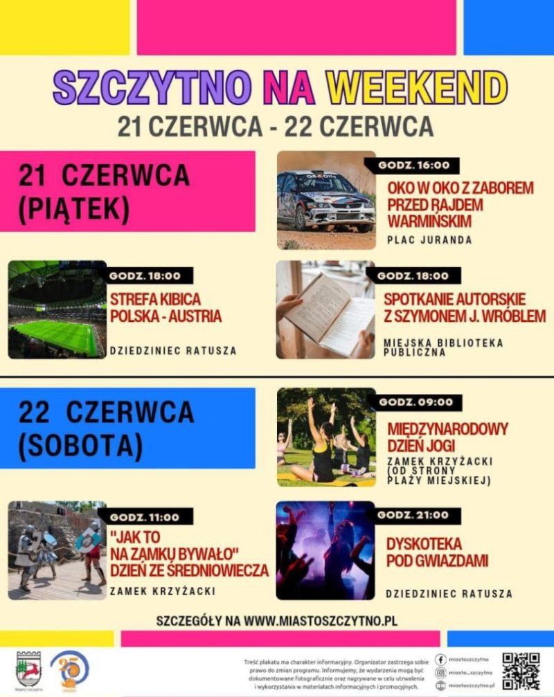 W nadchodzący weekend, 21-22 czerwca, Szczytno zaprasza mieszkańców oraz turystów na szereg atrakcji kulturalnych i sportowych. Organizatorzy przygotowali wiele ciekawych wydarzeń, które odbędą się w różnych częściach miasta.