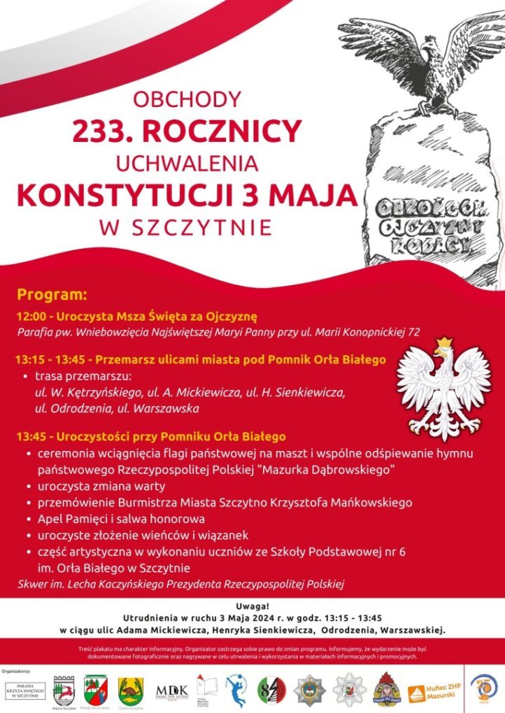 Szczytno przygotowuje się do uroczystego obchodu 233. rocznicy uchwalenia pierwszej w Europie, a drugiej na świecie konstytucji - Konstytucji 3 Maja. W planach wydarzeń znalazły się ceremonie, które będą hołdem dla kluczowych wartości narodowych i chwil historycznych, które ukształtowały Polskę.