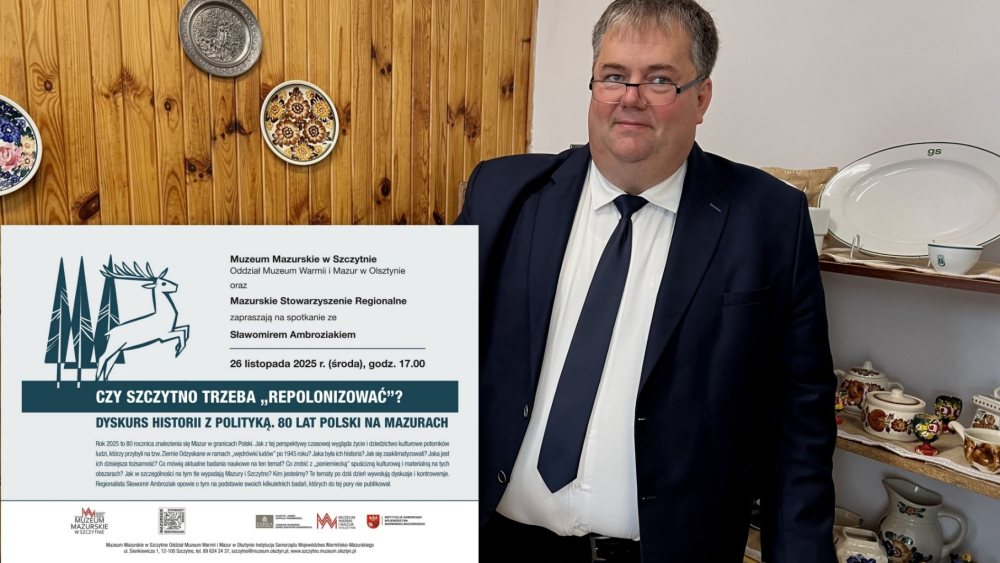 Słowo „repolonizacja” wraca do Szczytna jak bumerang. Raz w sporach o niemieckie nazwy w parku, innym razem w politycznych wystąpieniach, które grzeją emocje bardziej niż treść. 26 listopada w Muzeum Mazurskim w Szczytnie odbędzie się wykład Sławomira Ambroziaka – prawnika, regionalisty, autora książek o historii powiatu. O tym, czy Szczytno naprawdę trzeba repolonizować i skąd w ogóle wzięła się ta debata, rozmawiamy jeszcze przed spotkaniem. Odpowiedzi? Nie wszystkie padną dziś. Najważniejsze dopiero w muzeum.